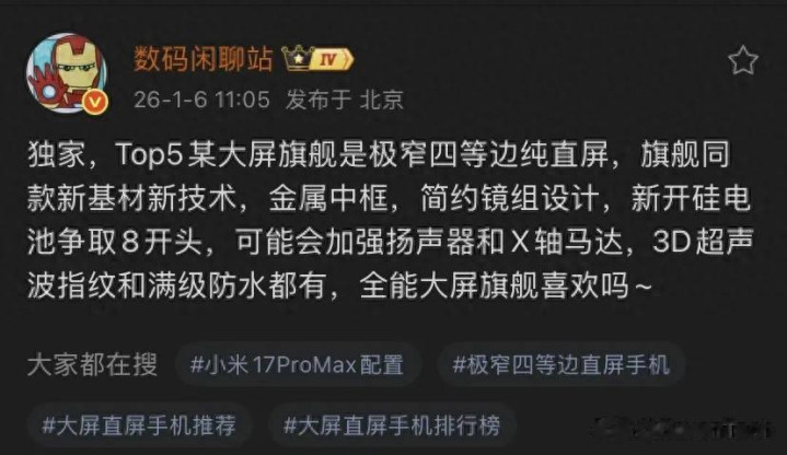 数码闲聊站透露:“独家,Top5某大屏旗舰是极窄四等边纯直屏,旗舰同款新基材新技术,金属中框,简约镜组设计,新开硅电池争取8开头,可能会加强扬声器和X轴马达,3D超声波指纹和满级防水都有,全能大屏旗舰喜欢吗~”