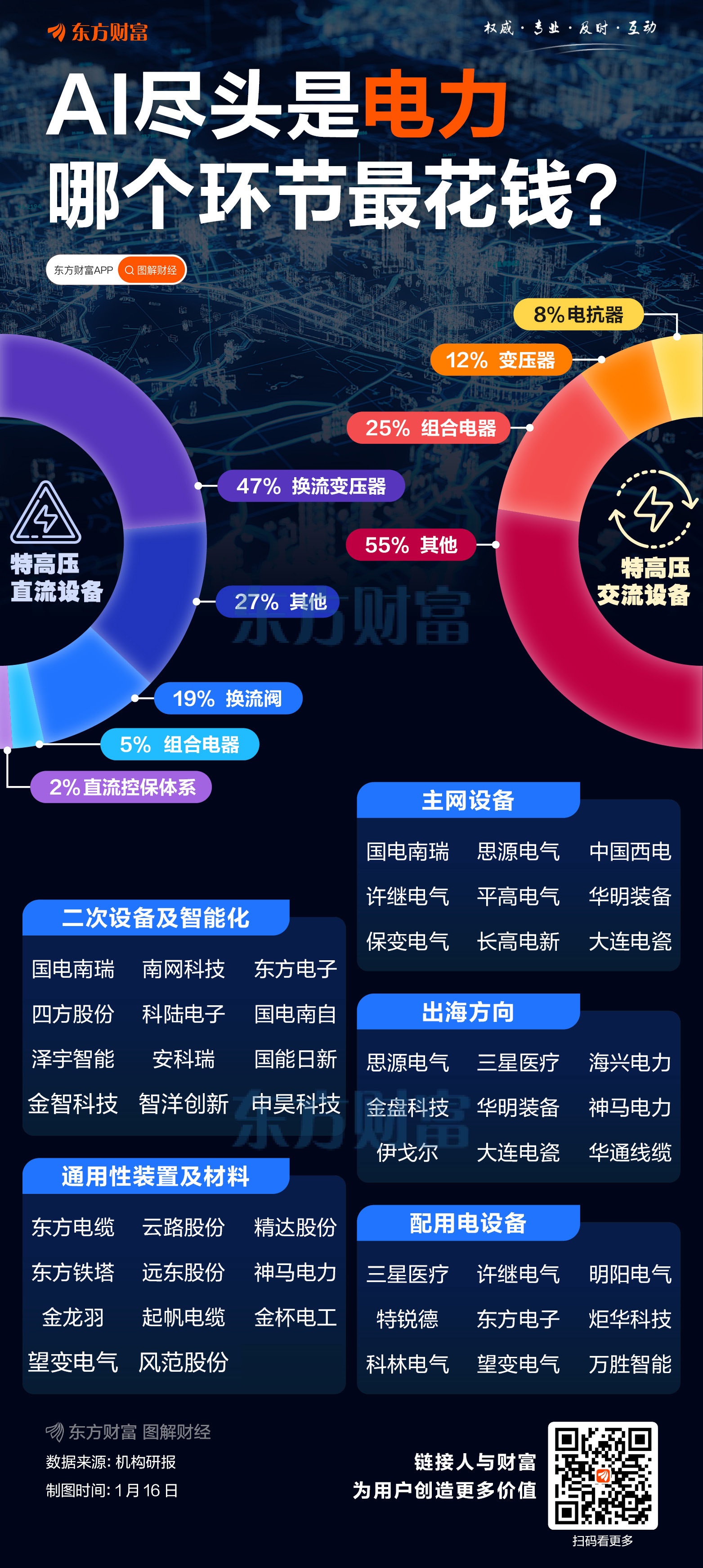 从机构研报观点看,按照使用场景,电网设备分为特高压直流(跨区域电力输送)与特高压交流(区域电网支撑)。主要设备包含变压器、阀门、组合电器、控保系统、电抗器等。
