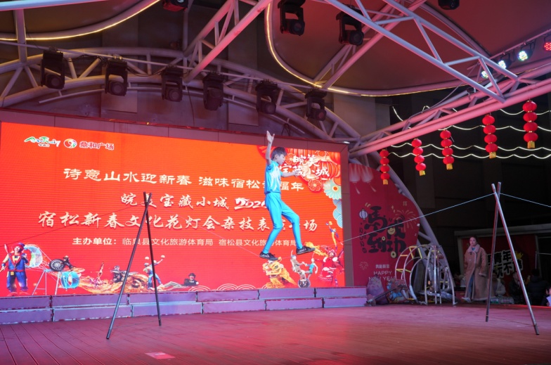 皖风传雅韵,两地共华章。本次花灯会的一大亮点,是以“文化走亲”为纽带深化县域文化交流,特邀临泉县开展专场文化交流演出,两地携手共谱皖风徽韵新篇章。舞台之上,该县非遗表演与临泉杂技同台献艺。宿松文南词、鱼灯、舞龙等非遗和民俗特色韵味悠长,尽显地方非遗的独特魅力;临泉杂技惊险奇绝、技艺精湛,高难度的表演赢得现场观众阵阵喝彩。