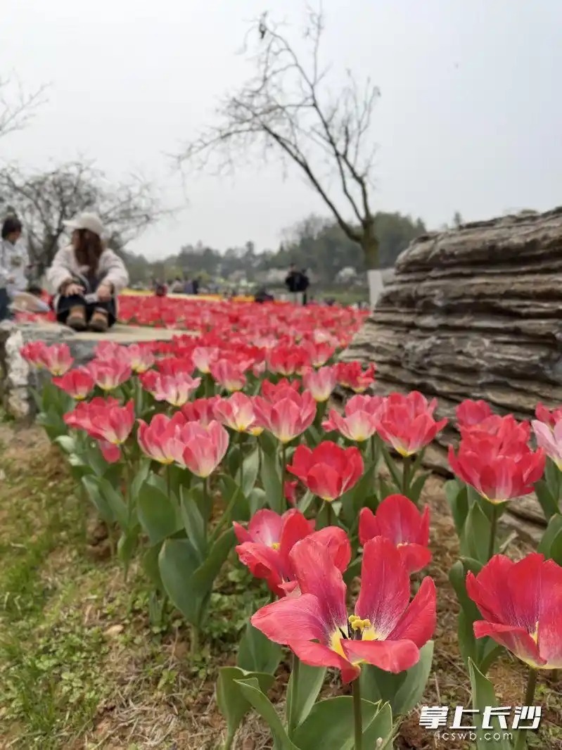 值得一提的是,与许多公园花展设栅栏不一样,此次花卉艺术季展区完全无阻隔,游客、花境与自然融为一体。园区将游客的需求前置考虑,在郁金香花境设置天然石台,青石板小径一直延伸到花田深处,这样游客既可以站立石台高处取景,又能深入花丛拍照,不担心踩踏花田,同时还能避免泥泞脏鞋。长沙园林生态园负责人告诉记者,刚开始决定不设阻隔时还担心花田被踩踏破坏,从当日现场来看,这一人性化的设置和长沙市民的文明素质相得益彰。