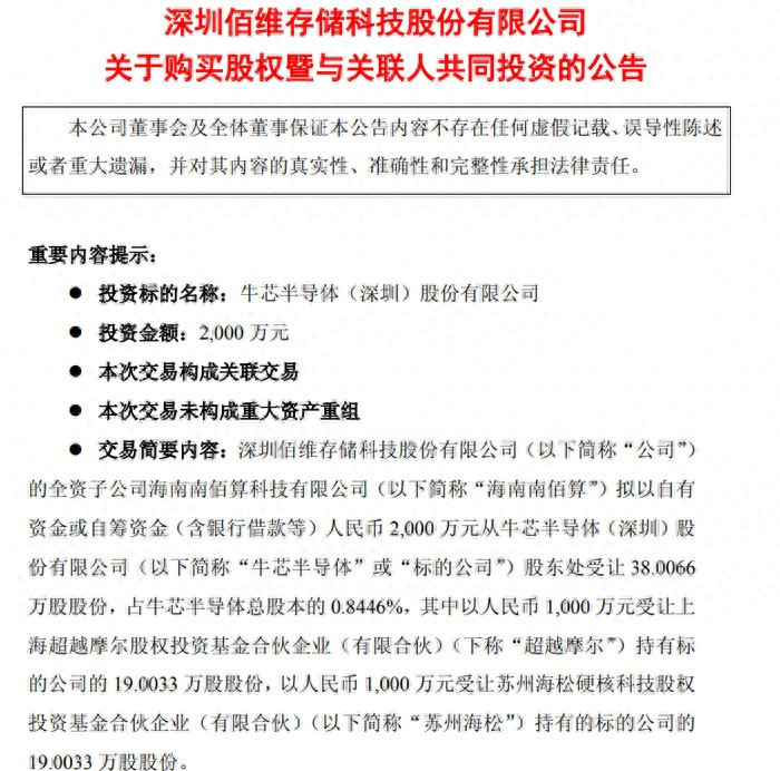2025 年 12 月 31 日,深圳佰维存储科技股份有限公司(证券代码:688525,证券简称:佰维存储)发布公告,宣布其全资子公司海南南佰算科技有限公司(下称 “海南南佰算”)拟以自有资金或自筹资金(含银行借款等)2000 万元,受让牛芯半导体(深圳)股份有限公司(下称 “牛芯半导体”)38.0066 万股股份,占牛芯半导体总股本的 0.8446%,本次交易构成关联交易但不涉及重大资产重组。